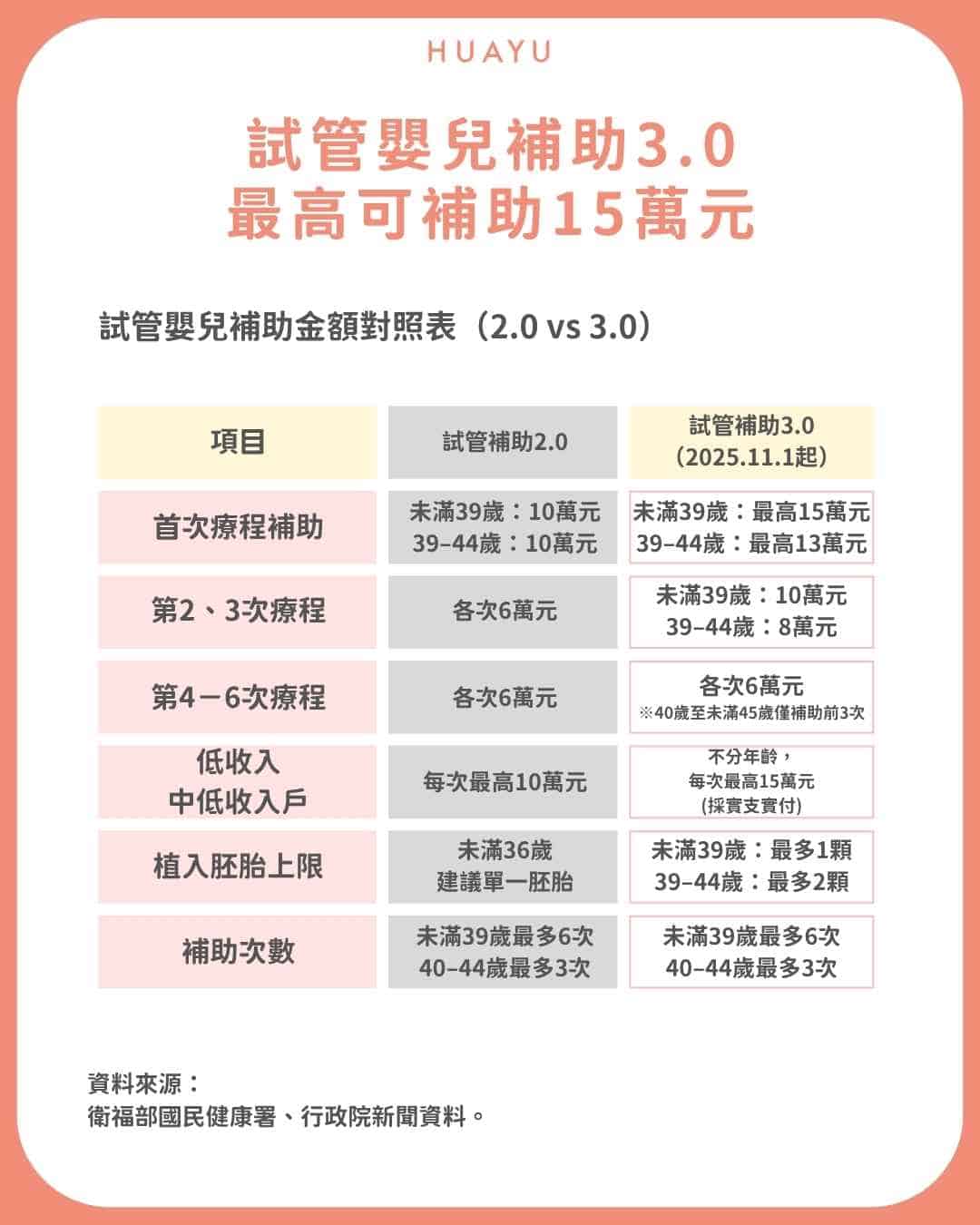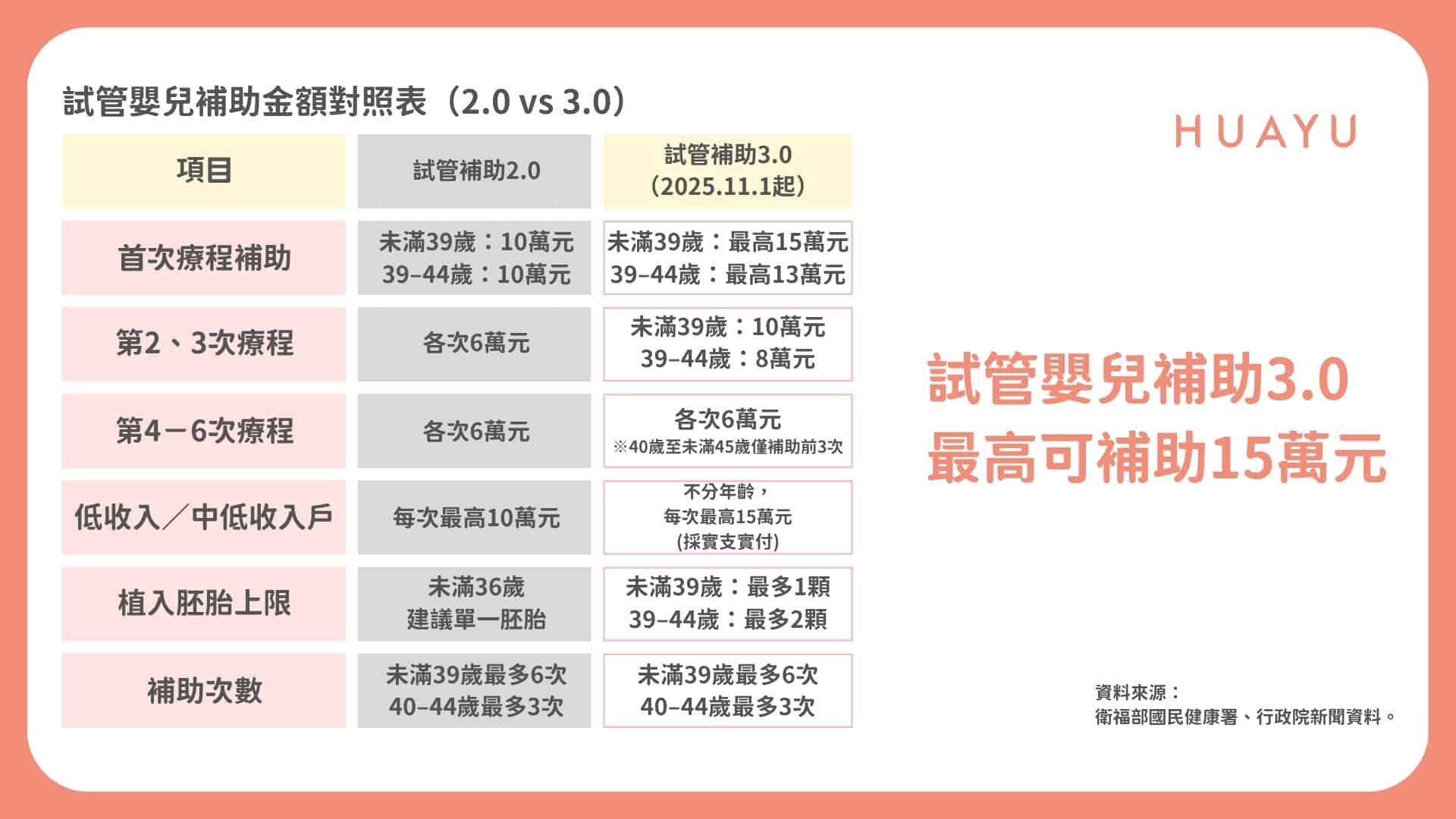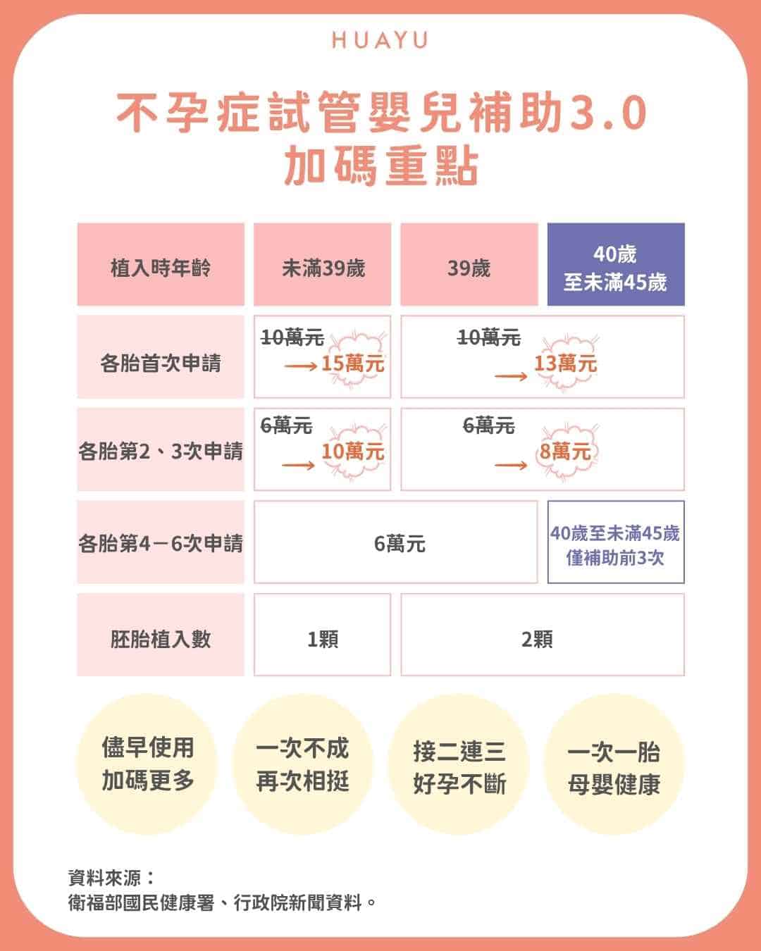 - 試管嬰兒補助 3.0 最高可達 15 萬元,