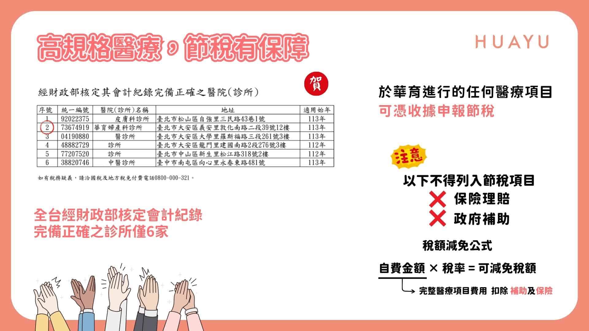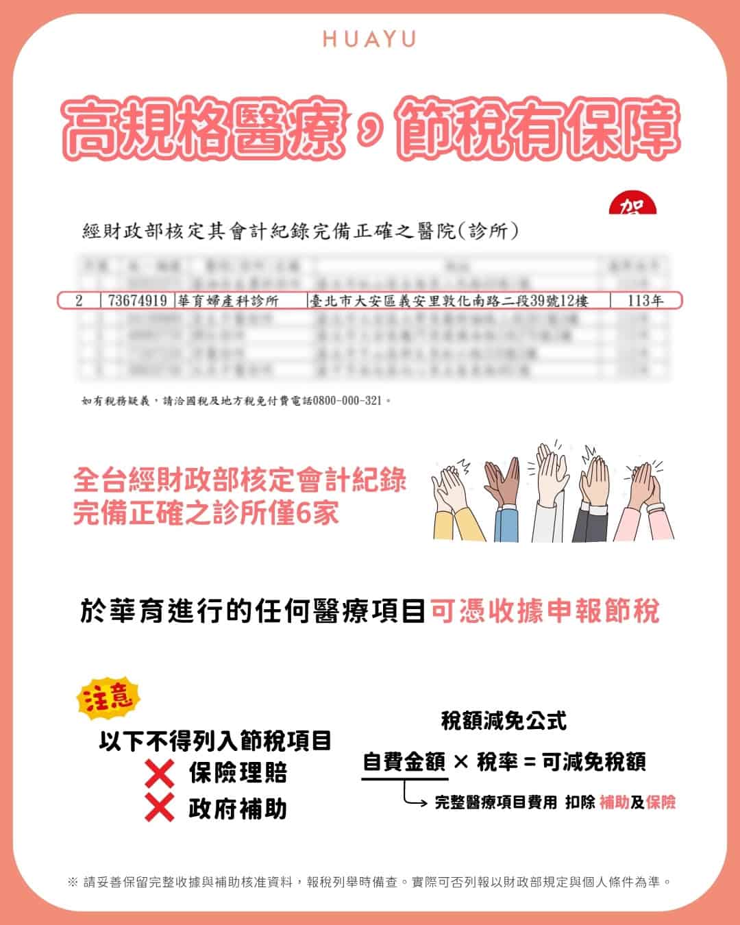 除了政府補助外,若療程屬自費醫療項目,具合法醫療收據者,符合財政部列舉扣除規定者可依法申報醫療費用抵稅。華育婦產科診所為全台僅六家通過財政部核可、可開立醫療抵稅收據的自費醫療機構之一,協助家庭在享受補助之餘,也能合法節稅,減輕生育開銷。