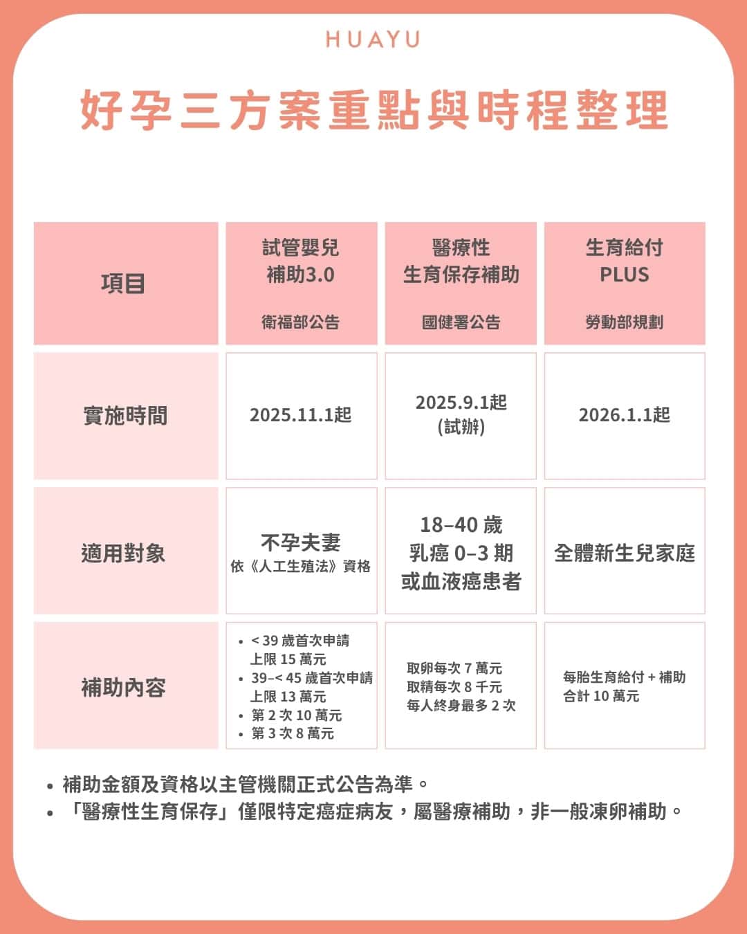 為鼓勵生育與協助家庭減輕生殖醫療負擔,行政院推出「好孕三方案」,將於2025年至2026年間陸續實施。以下為三項主要政策概要,實際補助內容、資格與金額,請依政府相關部門正式公告為主。